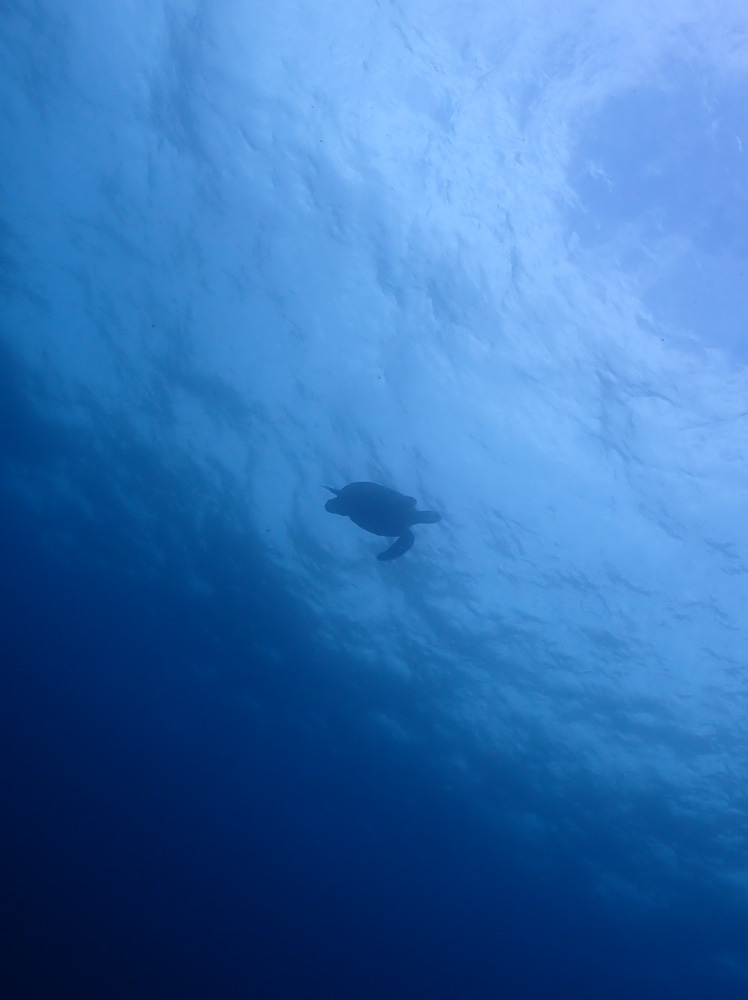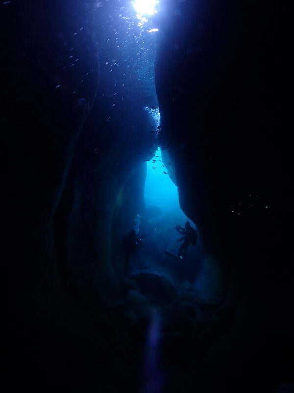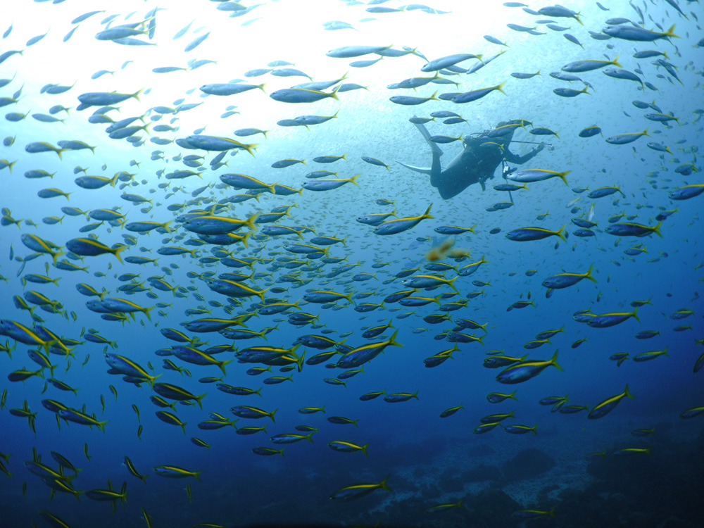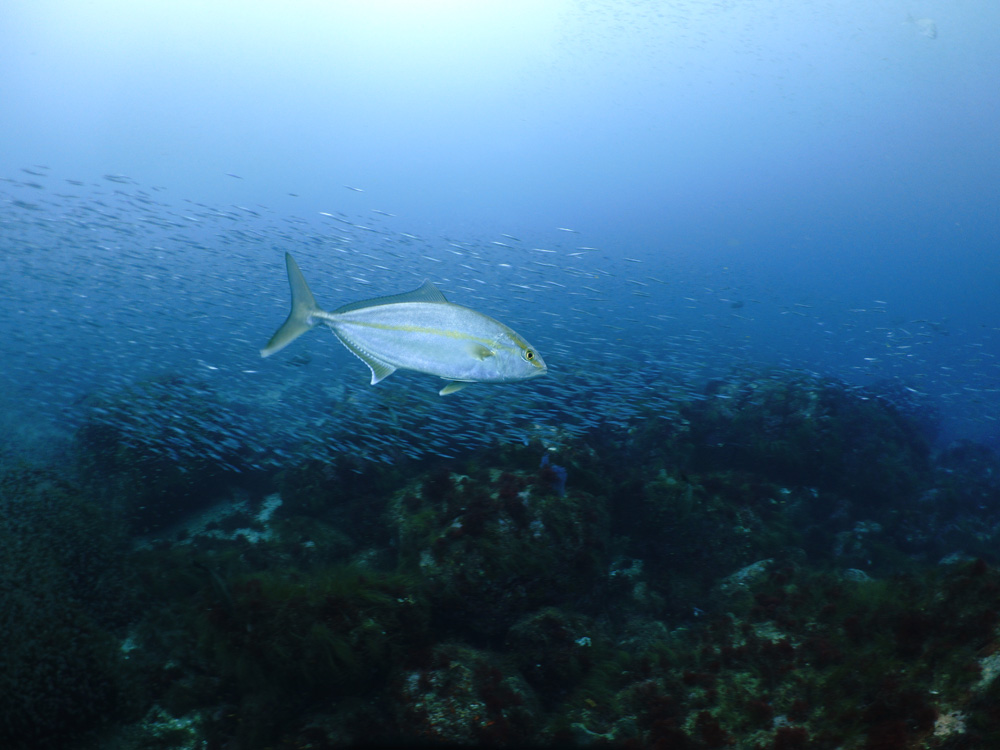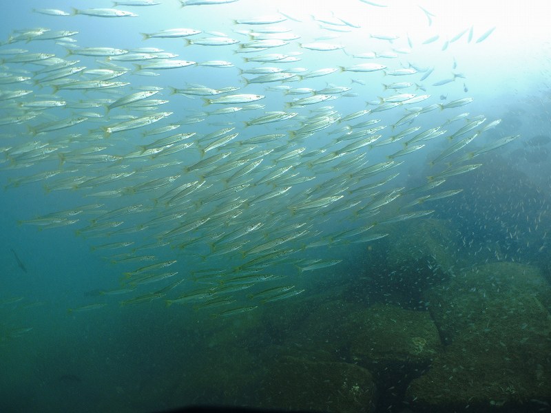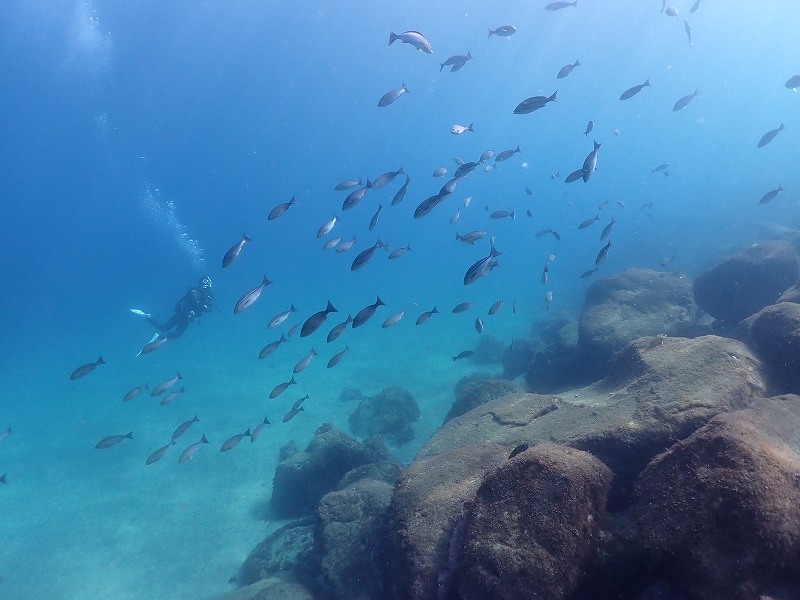 抜群の透明度に、頭上を覆うイサキのシルエット。